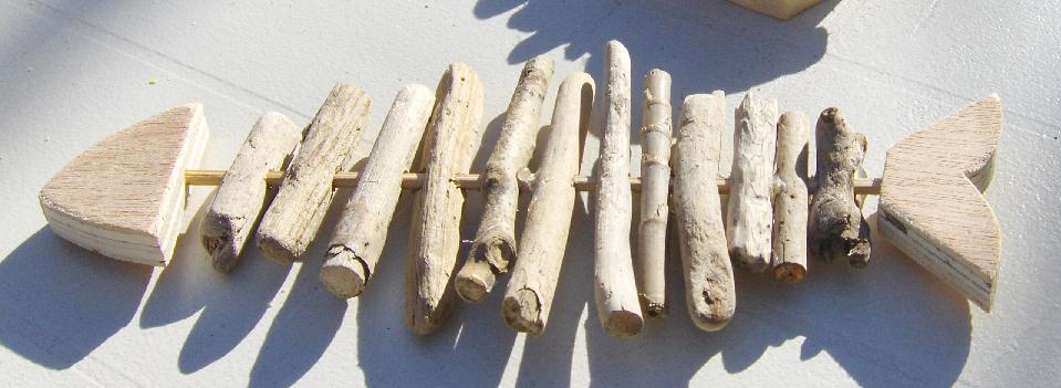 Le bois flotté est mon incontournable, je l’extériorise avec des matières naturelles (lin, chanvre, coton). J’y associe zinc, galets, objets cérusés, photophores mercurisés, résine epoxy ...